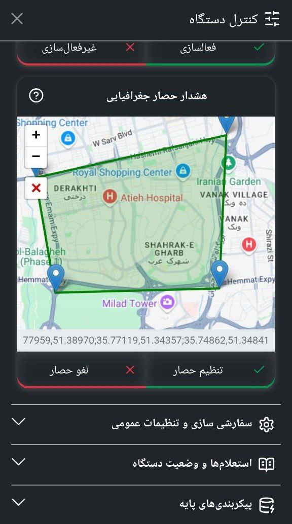 بله، در پنل ردیابی آسان ردیاب شما میتوانید تعداد حداقل 3 نقطه و حداکثر 5 نقطه را برای ایجاد حصار جغرافیایی روی نقشه پیاده سازی کنید و محدوده را به هر شکل دلخواه تنظیم کنید.